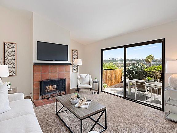 Welcome to your new home with impressive wide open views! This lovely townhome offers a spacious patio where you can relax and enjoy the ocean breezes. Inside, the floor plan is light and bright, with vaulted ceilings and sola tubes creating an airy ambiance. The entry level features a spacious living room with a cozy fireplace and slider opening to the large front patio. Upstairs, you'll find the kitchen with stainless appliances, a convenient breakfast bar, and an adjoining dining room. The primary bedroom boasts a new ceiling fan, walk-in closet, and a brand-new glass shower door in the ensuite bath. A versatile second bedroom with a wall-to-wall built-in desk is perfect for remote work or study. The oversized 2-car garage offers ample storage space and includes a laundry area with a washer and dryer and bonus refrigerator that convey. Plus, the newer HVAC system and whole house fan ensures comfort year-round. Recent updates include freshly painted interior, new lights, bathroom mirrors, door handles, and Decora outlets and switches throughout. Enjoy the modern touch of new LVP flooring in the kitchen and bathrooms, as well as new track lighting. As part of the community, you'll have access to a pool, spa, tennis/pickleball courts, and green areas. Located in a prime spot within the complex, you'll enjoy wide views overlooking the La Costa golf course. Just minutes away from Carlsbad beaches, the 5 freeway, and excellent shopping and dining options, this townhome offers both convenience and tranquility. Plus, it's in the highly rated San Marcos school district. Don't miss out on this fantastic opportunity!