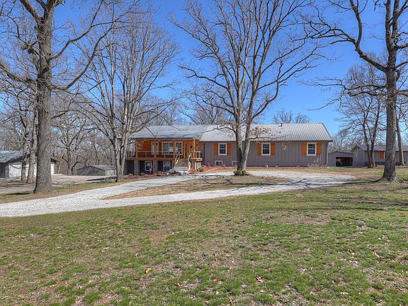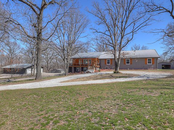 Conveniently located between Joplin and Seneca, built strong in 1982. Home offers circle driveway to approach new designed steps and large covered deck. First thing you'll notice is the massive, gorgeous craftsman style front door. Inside you find an open floor concept. Look around and you will notice lots of extras, such as striking wooden beams over the kitchen, granite center island with propane stove, unique lighting, glass paned barn doors to office, area that is a sitting area would make great formal dining, a pantry any cook would love, central vacuum. Nice sized utility room with cabinets, sink and granite. Primary suite is over-sized with jetted tub, tiled shower and double sinks in the bath. Master closet is an entire room itself. Jack n Jill bath between 2 bedrooms. Stroll downstairs to see the large family room with kitchenette, bedroom, bath and bonus room. Attached 2 1/2 car garage, one small door perfect for golf cart. The outbuildings include a 44x32 3 car garage, 50x40 barn, 24x24 shed and an additional 24x24 building. New septic installed.