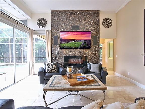 On Game Day, there is no doubt this is where you will want to host. Eaton Place is sought-after for the location within University Park Country Club. Very quiet and private - all you can hear are the birds. So close to the Clubhouse - you'll want to bike or walk. And, beautifully updated - you'll skip dinner reservations and cook for family and friends at home. Starting with professional architectural drawings and a hired contractor, the completed renovation checklist is extensive. Here you will find the most important and most expensive improvements are completed. Travertine flooring (no carpeting) and a very impressive kitchen is what catches your eye. An extraordinary appliance package includes Viking, Frigidaire, marble countertops, porcelain farmhouse sink, large pantry and this home is crisp - clean as a whistle - and no stone unturned. The modern gas fireplace can become the focal point on a chilly February in Florida. Fabulous views to the heated SALT pool/spa and outdoor space from every room in the house and once you step outside, ahh... there is more to enjoy. An extremely well-appointed outdoor kitchen finished with pavers and newer pool cage screening creates the ultimate retreat. Significant systems replaced in 2014 includes: a beautiful TILE ROOF, air conditioning, exterior painting, whole house water filtration, custom built-in shelving in the office/den and an overall classic floor plan that will never tire and always be popular.