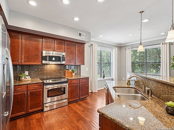 Escape to resort-style living and amenities at the gated community of Pinnacle at Oak Hills. Residents at this hidden gem enjoy being steps away from UT Health SA Medical and Dental School, all major hospitals, Veterans Hospital, coffee shops, cafes, and recreation. Gorgeous corner unit with garage parking and secure access to enter the building. Open floor plan with tons of natural light, crown molding, rich hardwood floors, and balcony overlooking the pool. The luxurious kitchen includes stainless steel appliances and sleek granite countertops extend to both bathrooms. Your spacious primary suite features a walk-in shower, double vanity, walk-in closet, and a Juliette balcony with serene views of Oak Hills Golf Course. The 2nd bedroom is split for privacy and the 2nd bath comes with a relaxing garden tub. Convenient elevator, trash chute, reserved parking garage space, and guest parking. Plenty of extra storage, plus the refrigerator, washer, and dryer are included. Community pool, spa, fitness center, and clubhouse. Only 15-20 min drive to the airport, downtown, the Pearl, and La Cantera/Six Flags. Easy access to 410 and I-10 for more shopping, dining, and entertainment nearby. This lovely home is move-in ready and perfect for a primary residence, second home, or rental property.