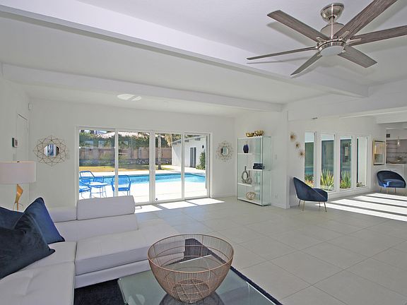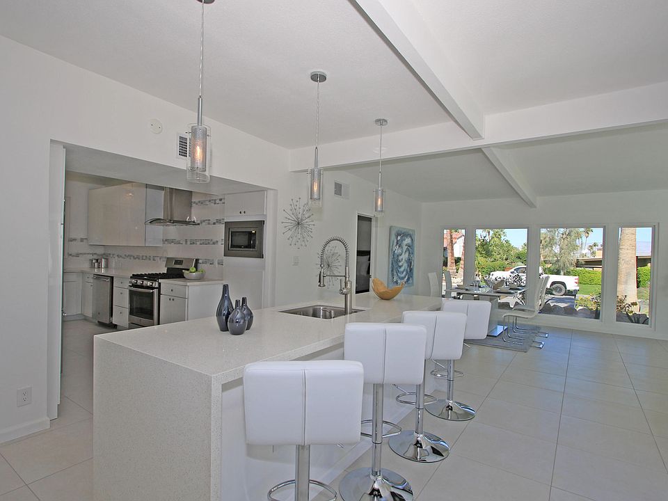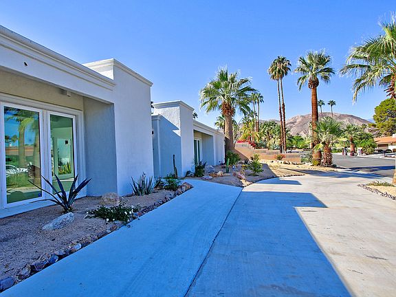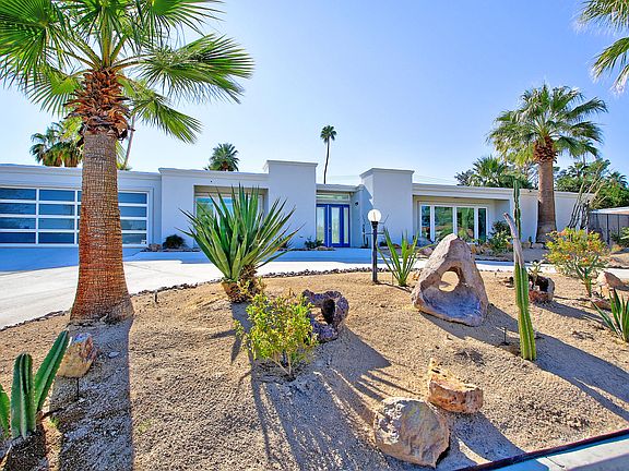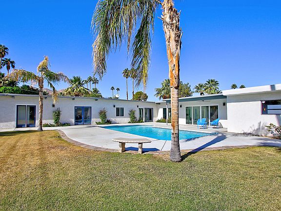 1960 Mid Century Modern REMODELED Pool Home. Raised Large Lot, Circular Drive Entrance, in Desirable South Palm Desert Neighborhood. BRIGHT Open Floor-Plan wraps around French Door Views to Pool - 3 Bedrooms - 3 Baths - Office, Indoor Laundry Room, Direct Access to 2 Car Garage with extra work area/storage. Sun soaked south facing swimmer's size pool & generous grass area with complete seclusion. Renovations includes New Kitchen & Bathrooms, dual pane windows, tile flooring and much more! RV Access possible through side gates. Located on quiet walking street, with NO HOA. Conveniently near El Paseo Shopping & Restaurants and all that Palm Desert has to offer!