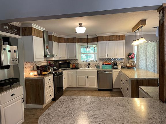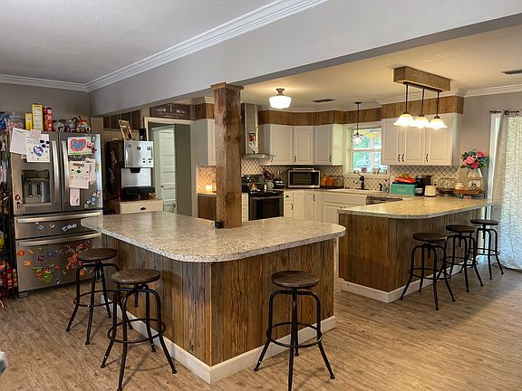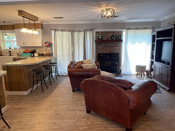 Man Cave off carport, shop, pond, chicken coop, wood stove in den, separate office, covered patio Mobile home on property for guests.