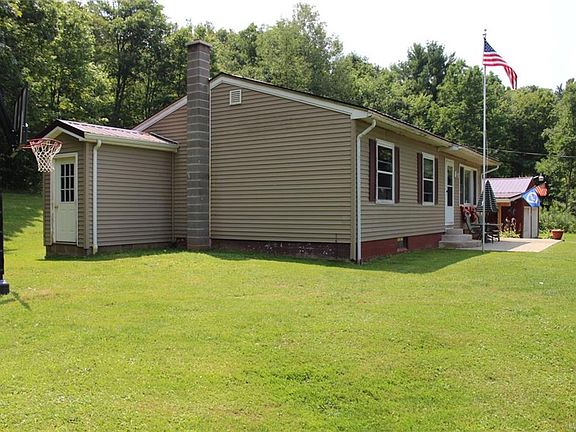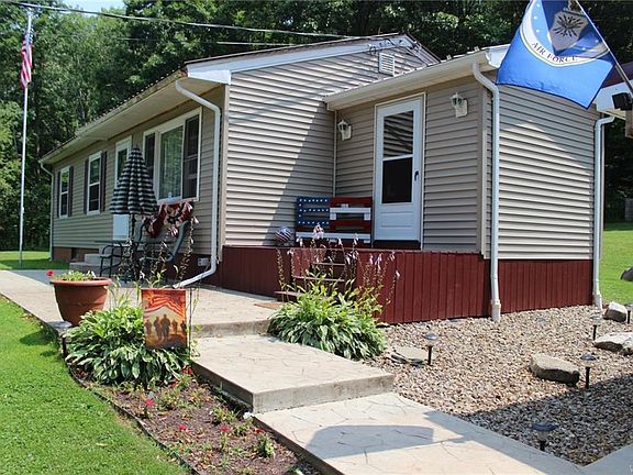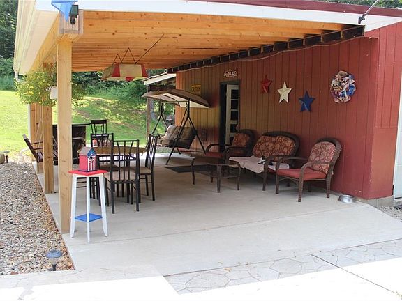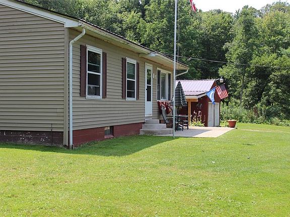 Very nice updated ranch on paved country road/wooded lot. Stamped concrete walkway and patio welcome you home. Spacious mudroom/new entryway door. Maintenance free siding, freshly stained decking, newer windows and newer metal roof all extras. Nice L shape kitchen; updated maple cabinetry/tile back splash and large pantry cupboard. Kitchen dining combo makes gathering easier. Eight year old addition includes large master bedroom with walk in closet and full bath with double vanity and no step shower. Large bright living room, 3 nice size bedrooms with closets and a second updated full bath with tub/shower. Full dry walkout basement with newer hot water tank and wood/coal furnace. Oversized two car garage with side awning and concrete patio is a great 3 season outdoor space!