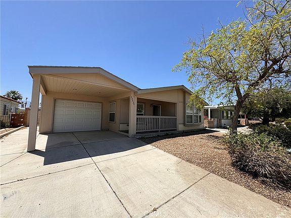Delightful 3 bedroom, 2 bathroom manufactured home located in the highly desired Palm Desert Greens, a 55+ community. Interior features include vaulted ceiling, carpet flooring in the living room and bedrooms, fireplace, ceiling fans and large bathrooms that feature separate shower and tub. The kitchen features a center island with sink, abundant storage and counter space, and recessed lighting. Exterior features include a front porch, large covered back patio and easy to maintain desert landscaping. Community features include three pools & spas, golf, pickleball, tennis, clubhouse, fitness room, restaurant/bar, and more. Schedule your showing today!