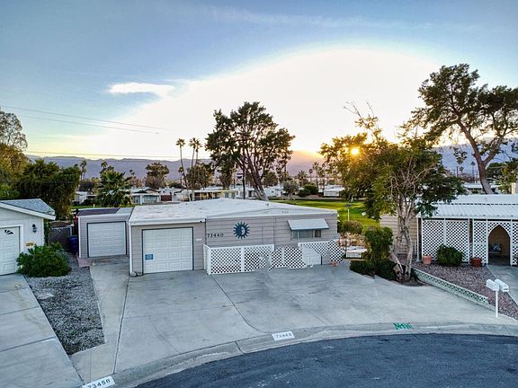 Welcome home to your sanctuary on the golf course! Indulge in desert living with this fully furnished 2-bed, 2-bath mobile home, ideally situated on the 8th green and 9th tee box of Tri-palms golf course. Beautifully updated, this residence offers breathtaking mountain views, patio living, double garages and the lowest development HOA fee at just $210 per month. The cozy interior living space is bathed in natural light, with a well-appointed kitchen that boasts modern appliances, updated flooring throughout all while the bedrooms provide comfort and privacy. Step outside to a spacious patio, perfect for al fresco dining with stunning mountain vistas. Enjoy direct access to UNLIMITED GOLF on a nine-hole PAR 3 course, PLUS a PGA-sanctioned 18-hole course. Tri Palms association also comes with access to clubhouse, fitness center, pools, tennis, pickleball, shuffleboard along with many social clubs. This is an unparalleled opportunity to embrace a lifestyle of the desert and enjoy nightly mountain sunsets. Don't miss out on this amazing opportunity. Call today for your private showing 760-574-2299