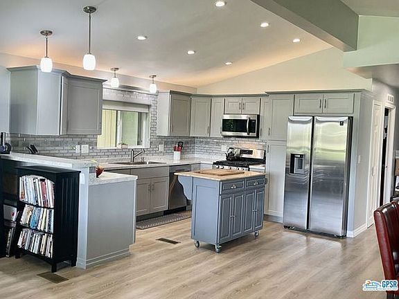 Reduced $10,000! Fashionably remodeled 1983 Double wide + in sought-after 55+ Suncrest CC. The location is superb, with the pool/spa diagonally across the street and beautiful views of the golf course and mountains from the rear patio. Handsome tile accents and vinyl plank flooring, cathedral ceiling, stainless steel appliances, cabinet pullouts, custom shades and contemporary lighting all add to the uplifting feeling you will experience. The primary suite is very large with an ample walk in closet and updated bathroom with a walk- or wheel-in spacious shower. The guest room easily accommodates a queen bed, with the second bath just outside the door. Laundry is conveniently in an indoor closet with an organized pantry just off the kitchen. The patios on the side as well as the back offer views of the golf course and mountains. A convenient shed gives great outdoor storage. There is leased solar with Sun Run at merely $79/month. Buyer must qualify to assume solar lease. Must be seen to be fully appreciated.