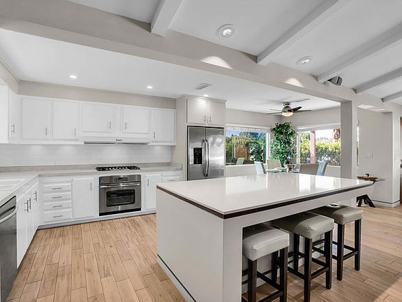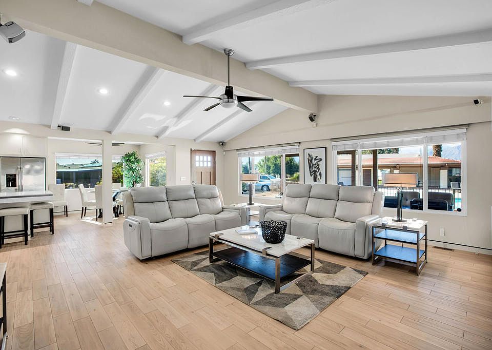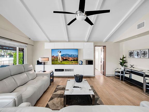 Simply Stunning desert dream home! Feast your eyes on the quintessential desert mountains and romantic sunset views. Updated with fine taste, sophistication, and valuable renovations that exemplify true pride of ownership! Step into one of the prettiest homes in Gated Suncrest Country Club! This open concept floorplan will wow you from the start. Remodeled with gorgeous white oak hardwood floors, quartz countertops, custom wood interior doors, recessed lighting, ceiling fans, custom built in cabinetry, newer windows, blinds. The spacious 1,874 square foot home features 3 bedrooms, 2 full sized bathrooms including the updated primary bathroom with dual sinks, and frameless shower door. The laundry room includes a built-in secretary center. Over $50,000 in recent upgrades, including new high-profile hip and shingle roofing, with added insulation, flexible ducting, extensive electrical panel upgrades and plumbing maintenance, copper water supply, 86-inch Sony Brava TV with Bose home theatre surround sound system. Relax on your freshly resurfaced patio, cool off under the awnings and drop-down sunscreens. or take a dip in the pool, close enough it feels like your own private pool. Suncrest Country Club is centrally located to shopping, dining, COD Street Fair, McCallum Theater, Sunnylands and just about everything the desert lifestyle has to offer else. This fantastic gated 55 plus community includes, golf, lighted tennis courts, pickle ball courts, clubhouse, and fitness.