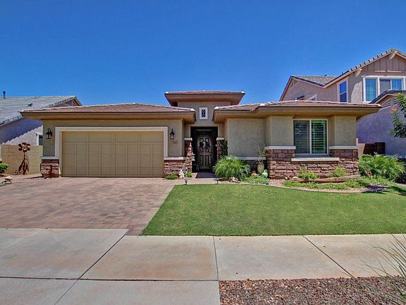You'll find this gently lived-in, Morrison Ranch beauty which shows like a model hard to resist! Plantation shutters, split flr plan, 12ft glass sliding doors at great room, upgraded gourmet kitchen w/gas cooktop & vent hood, backsplash, pull-out drawer trays, walk-in pantry & an entertainer's dream island. The Master bath offers a super shower w/seat ledge, dual sink vanities & lrg closet. Ceiling fans throughout, soft H2O & RO systems, double door den/office, sink & cabinets in laundry, overhead storage racks in the 3 car garage & RV gate. Outdoors find a lrg covered patio, pavers, synthetic grass & gas fire pit w/custom seating area. Gilbert schools/Mesa taxes. Community offers a lrg covered picnic/gathering area w/playgrounds, bsktball & volleyball. Want more information? Contact Shawn I. Rogers, 480-313-7031 or visit our web-site, it has ALL of the currently listed and still available re-sales, rentals and new builds, updated daily. www.MisterRogersHomes.com