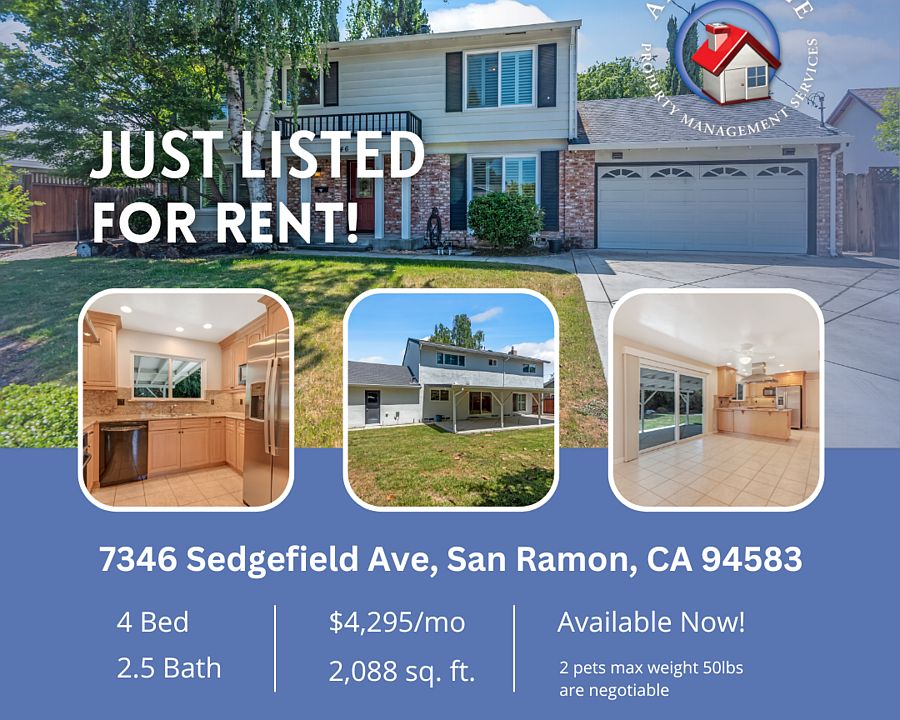 Schedule a Showing Online Come to see this charming 4-bedroom, 2.5-bathroom, 2,088 sq. ft., 2-story single family home near San Ramon Golf Club. The house offers a mix of hardwood and tile floors, plantation shutters and fresh paint throughout. The family room comes with a cozy gas fireplace and a large window and sliding glass door for great natural light. The nicely designed kitchen comes with an electric cooktop stove and oven, granite countertop and backsplash, and has tons of cabinet space. Directly off the kitchen is a casual dining room space which can also be used as a living room, and offers a second sliding glass door to the backyard, and can be separated from the main hallway by French doors. The second more formal dining room also has direct access to the kitchen and is separated from the main hallway by a glass panel door. The 4 bedrooms and 2 full bathrooms are located on the second floor. The master bedroom has a ceiling fan, two spacious closets and an ensuite bathroom with tile floors, granite vanity top and standing shower. The hallway bathroom also offers tile floors, a granite countertop, and has a tub/shower combo. The 3 other bedrooms also come with ceiling fans, and get great natural light. The home comes complete with a 2-car garage with built-in shelving, and a laundry area with washer and dryer. The beautiful backyard offers a large, covered patio and sizeable lawn, which along with the front yard will be professionally maintained. The neighborhood offers easy access to the 680 freeway and is near parks and the Iron Horse Regional trial. It is also located in the top-rated and sought-after San Ramon Valley Unified School District. We are looking for a long-term tenant who will take excellent care of the house. Available for move-in ASAP Rent: $4,295.00 /month Security Deposit ranges from $5,370.00 - $8,590.00 unless you qualify for our zero-security deposit option provided by Obligo. Applicants that do not meet all the Basic Criteria, but exceed the Minimum Criteria, may be approved with a higher security deposit. If you join Obligo, you will not be required to pay a security deposit! Minimum Lease Term: 12 months Preferred Lease Term: 24 months Pet Policy: 2 pets max weight 50lbs are negotiable with a $500/pet security deposit increase and a $30/month pet admin fee for the first pet plus $20/month for additional pets. Applicants with pets are required to submit a pet application through a third-party pet screening service at https apms. Refrigerator: Included Washer/Dryer: Included Gardening: Included Parking: 2-Car Garage Utilities: All utilities are the Tenants responsibility Showings are available by appointment only. Schedule a showing online by clicking the Schedule a Showing link. The property is professionally managed by Advantage Property Management Services. Leasing Contact: Harrison Smith (DRE# 01902063) READ THIS IMPORTANT INFORMATION BEFORE YOU SCHEDULE A SHOWING There is a $50/adult non-refundable application fee and ALL adults residing in the property must apply. We will (1) verify your identification; (2) check your credit report, unless you receive a Government Rent Subsidy and request to provide verifiable alternative evidence instead of a credit report no later than when the application is submitted; (3) verify your household income and employment, if applicable; and (4) verify your rental history with previous landlords. Most applications are processed in 2-3 business days from the date we receive a completed application and all supporting documentation. Security Deposits are calculated using a risk-based model. Applicants who meet all the Basic Criteria may be approved at the advertised security deposit amount. Applicants who do not meet the Basic Criteria but exceed the Minimum Criteria may be approved with a higher security deposit, not to exceed the legal maximum. We offer a security deposit-free option for qualified tenants using Obligo billing authorization technology. Security Deposits for active-duty military and properties subject to AB12 cannot exceed 1x the rent. Prior to move-in, proof of a current renters insurance policy with APMS listed as an Additional Interest and coverage of at least $300,000 for personal liability must be provided. Please DO NOT APPLY if your credit score is below 650, your household income is less than 2.7x the asking rent, you have ever been evicted, you have negative rental history, or your pets do not comply with this property's pet policy. If you have a Government Rent Subsidy and elect to provide verifiable alternative evidence of your reasonable ability to pay rent instead of a credit report, you must inform APMS when you submit a rental application. Failure to notify us at this time may disqualify you from participation in alternative verification. We will provide a list of required documentation after we receive a request. All documentation must be provided within 48 hours. Contact us to learn more about this process and the required documentation. All verifiable sources of income will be considered. Pursuant to CA Gov. Code 12955(o), the income multiple is based on the amount of rent that will be paid by the Applicant (not the total rent amount) if the Applicant has a rental voucher or other housing subsidy. To help ensure all residents understand our animal policies, all Applicants must submit an animal application at https apms. All Information Deemed Reliable But Not Guaranteed. APMS is not responsible for content published by third-party listing websites (i.e. Zillow, Trulia, Hotpads, etc). Central Heat/Air Disposal Pets Allowed Refrigerator Included Washer/Dryer In Unit Washer/Dryer Provided