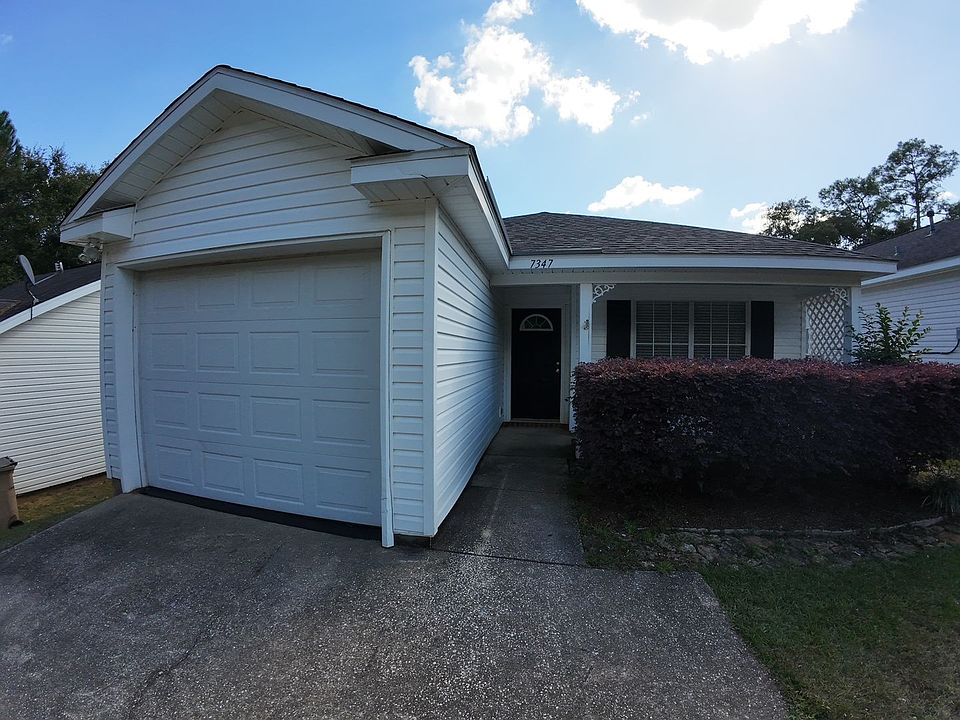 Cottage style home with garage, kitchen includes all appliances, living room, dining room, privacy fenced back yard, new flooring, end of cul-de-sac, close to shopping, restaurants, movie theater, ballpark and the Mobile Airport.
