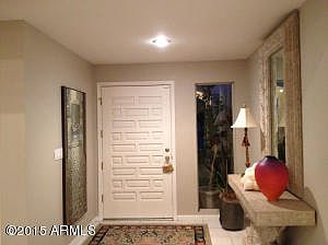 This is a Tranquil Paradise & a Rare Find in the center of Scottsdale! Elegant Luxurious Malouf Patio Home on a large 11 341 sq ft lot in the best cul-de-sac! Beautiful private courtyard entry to the most popular open floor plan with 3-way fireplace. What a wonderful entertaining home with Vaulted Smooth Ceilings & lots of recessed lights. Plantation shutters throughout lots of ceramic tiles & neutral upgraded carpet. Gourmet kitchen opens to Family Rm w/very classy kitchen cabinets. Bonus Storage Rm in garage w/lots of built-in cabinets. Fantastic outdoor living with resort like backyard! Cool blue pool & spa! A built-up area for BBQ & Saltillo Tile back patio! 2nd patio w/covered awning! Lots of tall palm trees lush green bushes & mature landscaping. You will absolutely fall in love!!!