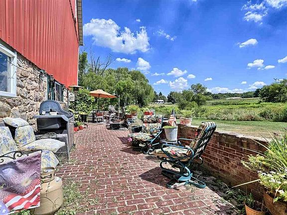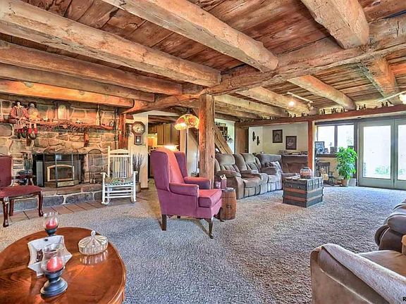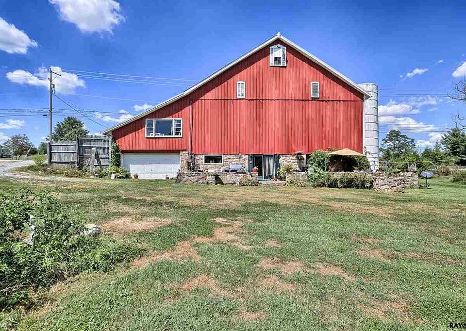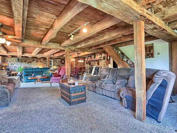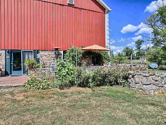 Historic barn with 1st floor renovated into a unique 2232 sq. ft. home with stone walls, stone kitchen floor and exposed posts and beams. Open floor plan with stone fireplace as focal point. Large living room windows & patio doors. 2nd & 3rd floor could have commercial uses. see mls# Pond & stream on property. Silo & Outbuildings. Detached 2 car cement block garage with electric. 2 more garage doors in barn. Circular driveway. 2.86 acres.