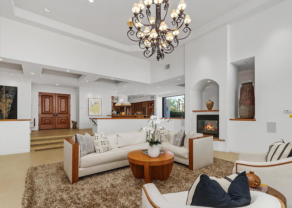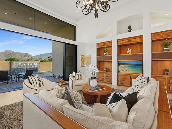 Gorgeous VIEW Custom Home in Ironwood Country ClubThis highly upgraded Desert Contemporary is perched on an elevated lot and offers sweeping southwest mountain views that immediately capture your attention from the moment you enter through the double entry front door. Designed for the ultimate indoor-outdoor lifestyle, the spacious open floor plan features soaring 18-foot ceilings and walls of glass that open to the pool, spa, and multiple entertainment areas.The elegant living and dining areas share a double-sided fireplace and flow into a media room and executive-style library/office. The chef's kitchen is a dream--featuring custom cabinetry, a massive center island, walk-in pantry, wine storage, beverage refrigerator, ice maker, and direct access to a private patio with stone fireplace, sitting area, and outdoor kitchen.The luxurious primary suite offers stunning views, a cozy fireplace, a spa-like bath with exercise space, and a generous walk-in closet. Two beautifully appointed guest suites each have ensuite baths and private patio access. An additional room offers flexible use as a fourth bedroom, office, or retreat.The oversized lot is impeccably landscaped with stone-like interlocking pavers, artificial turf, and mature, thoughtfully selected trees and plants--offering a rare blend of exceptional views, privacy, and sophisticated desert living.Ironwood Country Club is a private club , nestled into the San Jacinto Mountain and features two championship golf courses, state of the art fitness center and a beautiful Tuscan designed club house. Membership opportunities are available