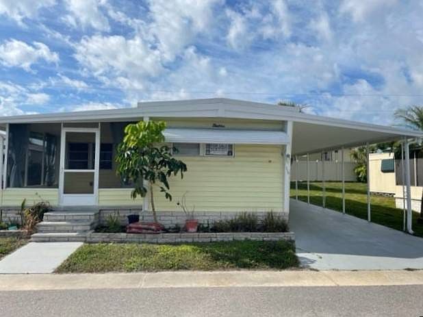 This home is listed for SALE by Carol with SLR Mobile Homes. The lot rent for this home is $685.00 per month and includes water, sewer, trash, lawn mowing & all the park amenities. This home is located in a Pet Friendly (2 dogs up to 40 lbs. (Breed restrictions apply)), 55+ (additional person can be 18+) Age Required Retirement Community. This Beautifully remodeled home has 2 bedrooms, 2 bathrooms, newer roof over (zero leaks), new central HVAC (10/2022, 10-year warranty), New drywall throughout, New 3/4" plywood subfloors throughout, new waterproof (cork backed) Luxury Vinyl Plank (LVP) Flooring throughout, Pest treatments done & a 6-month paid contract for termite treatments in the future, new appliances, new garbage disposal, fresh paint and baseboards throughout, new real wood window treatments, new screened in porch with much more. The living room has lots of windows with new real wood mini blinds to block light and heat, new LVP flooring, a beautiful epoxy lighting feature and plenty of room to enjoy a quiet evening or to entertain friends and family. The dining area has a new ceiling fan and will seat 4 adults comfortably. The kitchen has plenty of cabinets including a pantry, tile backsplash, new lighting, glass top stove, new stone overlay countertops, new garbage disposal, large refrigerator with the freezer on the bottom and an espresso machine. Both bedrooms have access to a bathroom, you choose which one you want to make the main bedroom. The guest bedroom has a nice sized closet, new ceiling fan, large windows with new wood blinds and has access to the guest bathroom. The guest bathroom is accessible from the hallway or the guest bedroom, large vanity with storage, LVP flooring, a large walk-in shower with tile that goes all the way to the ceiling. The main bedroom is also a nice size with LVP flooring, new ceiling fan, large windows with wood blinds and a large closet. The main bathroom has a nice sized vanity with storage, walk in shower with tile to the ceiling, rain showerhead and LVP flooring. The large screened in porch is accessible from the front of the home and the living room, with new screening and plenty of space to wake up with your morning coffee (espresso!) or tea and enjoy our beautiful Florida weather. The shed is located just off of the 2 car, freshly painted, carport with a whirlpool washing machine and a whirlpool dryer, with built in shelving to give you even more storage space. This is a beautifully remodeled home that is just waiting for you to call it your new home. For more information, to schedule a showing or to make an offer, please call Carol. Bay Ranch is a Beautiful 55-Plus (18+ year old can live in the park if the primary resident is 55+) Park centrally located, close to restaurants, shopping the St. Pete Airport and the beaches! Amenities include a heated pool, shuffleboard, horseshoes, gym and a Clubhouse with numerous activities. R.V. and Boat Storage lot in the park available to homeowners, you can store either an R.V. or a boat (not both). DISCLAIMER: The information in this listing is believed to be true and accurate and has been provided by the seller. SLR Mobile Home Sales, LLC cannot guarantee or warrant the accuracy of this information or the condition of any property. Since Mobile Homes are sold AS IS, we recommend that you inspect any home that you are interested in purchasing and recommend that it be independently verified by appropriate professionals. The buyer assumes full responsibility for obtaining all current rates of lot rent, lot rent payment method, lot rent due dates, fees associated with the mobile home community, park, or home from the community/park manager. Buyer is also responsible for getting any park rules, regulations and lease agreements from the community/park manager. SLR Mobile Home Sales, LLC is not responsible for the quoting of or providing of said fees, req