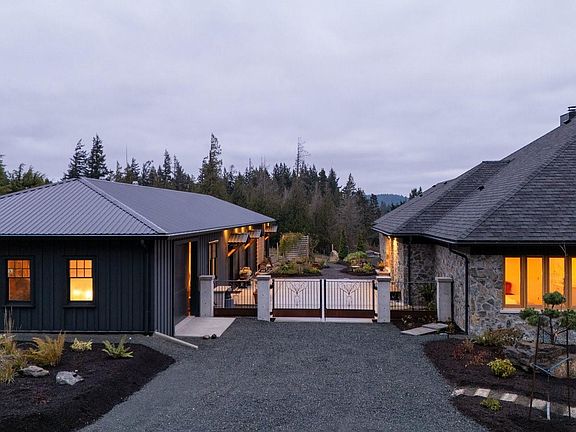 Nestled on 2.4 acres of gently rolling hillside, this exceptional Metchosin estate features a 4,000+ sq.ft. Rancher & 1,380 sq.ft. detached building with an art studio, bathroom, workshop & garage. The exterior reflects French provincial elegance, with a granite façade, wrought iron detailing & a concrete water feature signaling the craftsmanship inside. Inside, polished concrete floors, exposed beams, reclaimed brick accents, and inlaid wood detailing create an inviting, artistic atmosphere rarely seen in modern construction. The expansive great room centers on a bespoke fireplace & opens to the patio through multiple custom French doors. The kitchen includes a dedicated prep area for added convenience. The primary suite offers a serene, private retreat. Geothermal heating enhances efficiency and lowers the home’s carbon footprint. The property captures sweeping views across Haro Strait to the Olympic Mountains, providing a dramatic & inspiring backdrop to this one-of-a-kind estate.
