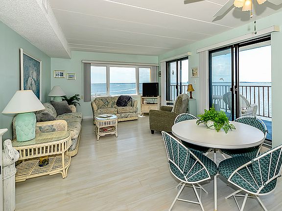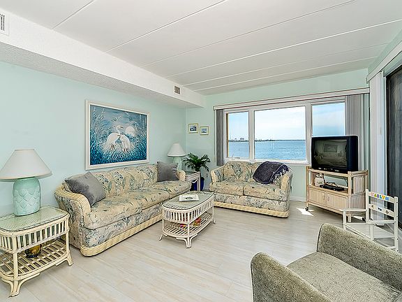 DIRECT BAY FRONT condo with incredible panoramic bay views from the living room, dining room and kitchen! Enjoy spectacular sunsets while you relax on the large balcony. This beautiful 2 bedroom, 2 bath END UNIT condo includes many upgrades in 2017, including New HVAC, New Quartz countertops in kitchen, New Refrigerator, Dishwasher, Washer, Dryer, Hot water heater and furnishings. Ponte Vista is a well managed building which includes a bayfront pool, elevator, covered & uncovered parking, storage locker, outdoor shower and boat docks that can be rented thru the association. Close proximity to the beach, grocery store, great restaurants, playground & dog park. You will LOVE the waterviews & great location!!! Sold fully furnished.