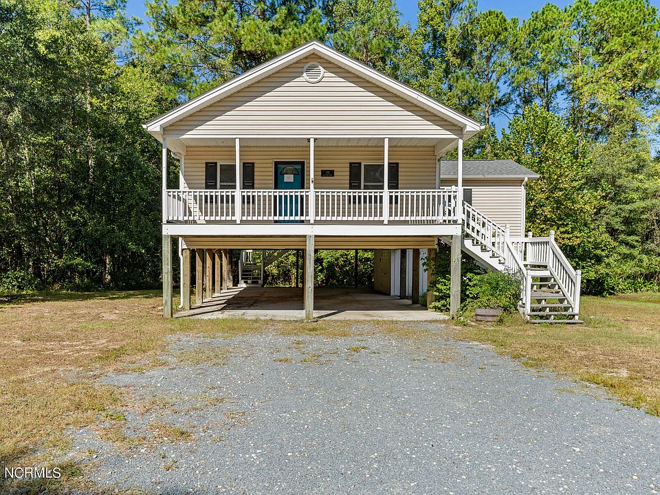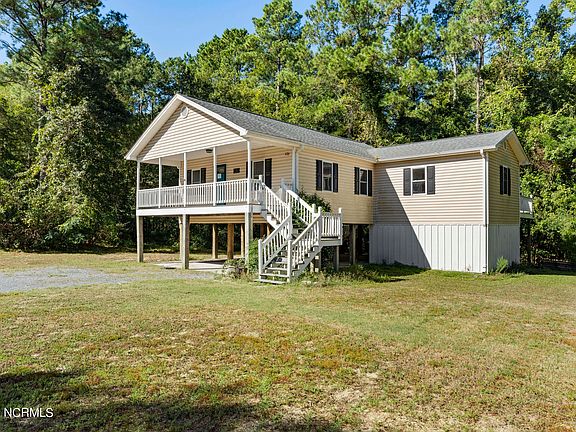 Move-in ready home on stilts in established River Bend community along northeast Cape Fear River. Corner lot is over half an acre edged with mature trees and includes a small pond. Step up to front porch entry from unpaved drive. Neutral walls and LVP flooring across semi-open common area comprised of living room, dining room and kitchen with breakfast bar, separate laundry room. Quartz counters, stainless appliances, soft-close cabinets among upgrades. Primary suite offers high ceilings, attractive craftsman trim, oversized closet, private bath with custom tiled shower. Two guest bedrooms at front of layout, shared full bath in hall. Rear wood deck overlooking acreage wonderful space for your morning coffee or entertaining on 4th of July! Community is outside Burgaw proper; roughly 40 minutes to Wilmington, 50 minutes to Topsail Island, and 2 hours to Myrtle Beach. Camping, boating, golf, regional historic attractions nearby!