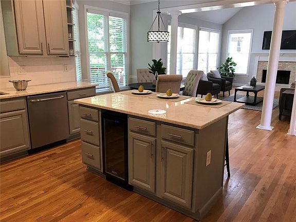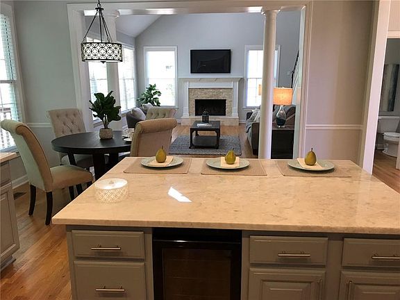 - Kitchen Features: Eat-in Kitchen, Pantry, View to Family Room, Stone Counters, Kitchen Island, Cabinets White, Wine Rack