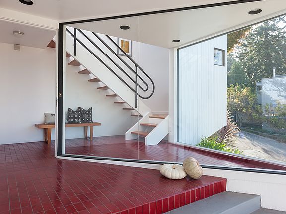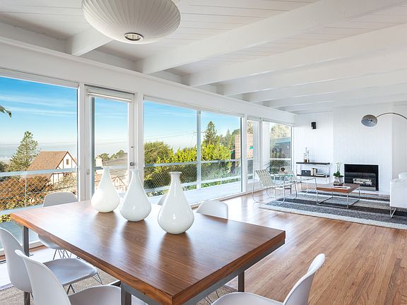 Architect Donald Olsen designed Mid-Century modern home built in 1956. Recent renovations according to architect's suggestions. Spectacular Bay, city, bridge and Mt. Tam views. Fabulous indoor/outdoor flowing floor plan. Floor to ceiling living room windows draw you out to west-facing deck. Level front patio for play and sunset dining. Large, quiet landscaped corner lot. Features Include:- 3+ Bedrooms, 2 white, marble bathrooms - Beautiful hardwood floors - Plus room for office or guest room has easy access to back patio, arbor and raised vegetable bed