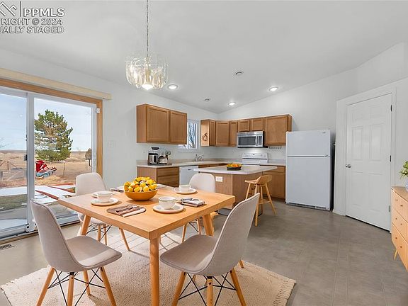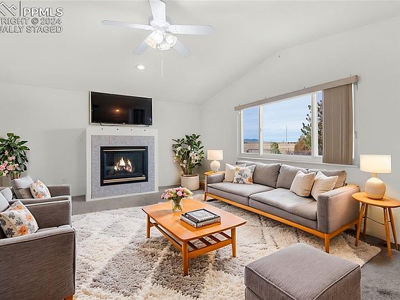 Set on a peaceful 1-acre lot in Pueblo West, this ranch-style home boasts a great floor plan with spacious living areas. The lovely kitchen features an island, pantry, and is adjacent to a formal dining space. The large family room is perfect for relaxing, complete with a gas fireplace and a large window that showcases beautiful mountain views. The main floor includes three bedrooms, including a primary suite with a walk-in closet and an ensuite bathroom featuring a jetted tub and free-standing shower. The two additional bedrooms share a full bathroom. The unfinished basement offers excellent potential for additional living space and abundant storage. Outside, the large backyard features a storage shed, and the 3-car garage provides ample space, including a handicap ramp for easy access. Additional RV parking is available. The home is equipped with Anderson Renewal windows, an ADT security system, and an Acorn chairlift to the basement. Plus, a fire hydrant at the corner of the property provides added peace of mind. This property offers a tranquil setting with great living space and plenty of potential. 3 virtually staged photos included.