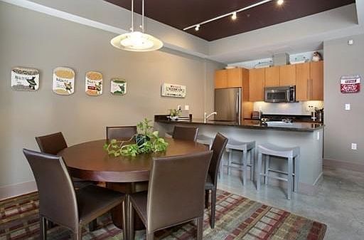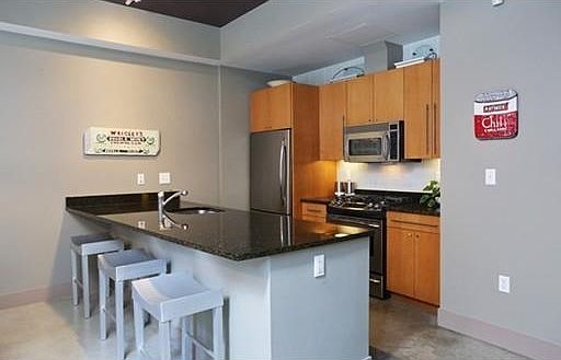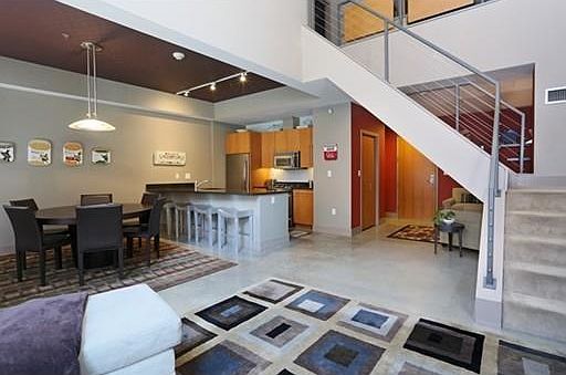 This sophisticated loft duplex is located on the most desirable side, the West Block, of the ArtBlock complex. Towering ceilings, two-story windows and a private entrance highlight this unique urban residence. Gourmet kitchen with a large granite breakfast bar, glass backsplash and stainless appliances is open to the living and dining areas making it perfect for entertaining. This home features sleek design elements including concrete flooring and stainless steel cable staircase railings. The large master bedroom has an ensuite bath and a spacious custom walk-in closet. There is an open loft area on the second floor that is ideal for a home office and could easily be converted to a second bedroom. There is an additional den area and half bath on the first level. Custom window treatments included. Additional amenities include in-unit washer dryer, central air, gas cooking and a garage parking space with elevator access. Professionally managed and pet friendly association.