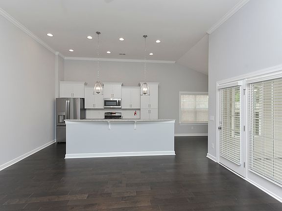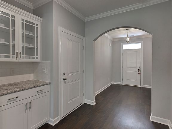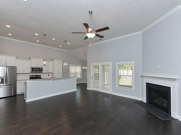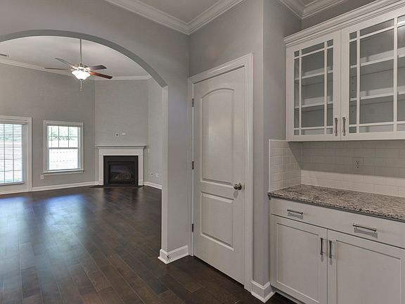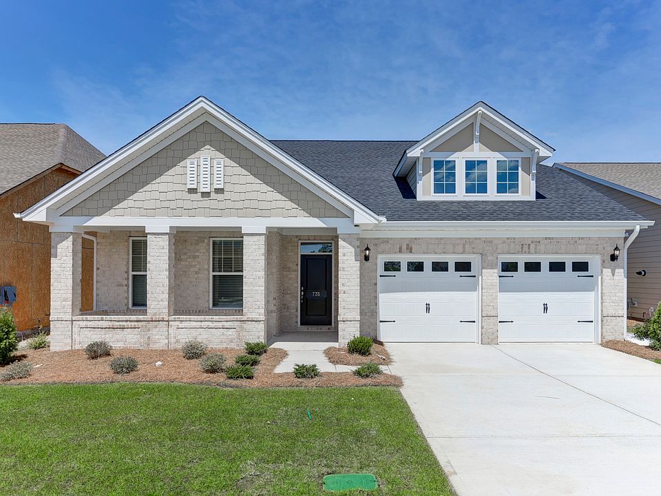 The Allerton with a brick front, is a true ONE-STORY with three bedrooms and two baths. Enjoy relaxing on your large rocking chair front porch. Upon entering the foyer you will love the arched entryways with gorgeous hardwood floors and designer paint scheme in Passive Gray. This home also includes BLINDS! The open floor plan lends way to a butlers pantry, large kitchen island, GE French-door refrigerator, upgraded gas stove, beautiful white cabinets and quartz countertops overlooking the family room with a cozy gas fireplace. The master suite has a luxurious private bath with an amazing barrier-free tile shower, ceramic tile floors and spacious walk-in closet. Enjoy your evenings on your covered porch overlooking a beautifully fenced-in back yard in a courtyard setting with full yard irrigation. In addition, the HOA maintains the front yard.