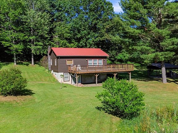 Escape to your own private hideaway with this charming 2 bedroom, 1.5 bath log cabin perfectly nestled on 20.25 acres of serene landscape. Large front deck overlooking 2 stocked ponds and stunning mountain views. Enjoy the seamless integration of the kitchen, dining and living room space. The open concept design creates a spacious feel to this cozy, quaint home. Full size bath and bedroom with walk in closet also on main floor, allowing for first floor living. The mostly finished basement not only expands your living space, but also enhances the overall functionality and comfort of the home. Inviting wood fireplace is the focal point of the family room. Nice size bedroom and laundry with half bath rounds off the basement area and is the perfect space for a small, personal living quarter for guests. Home is located on a private road, so please, NO DRIVE BYS! Call today and schedule your own personal tour of this magnificent property...you'll be glad you did!
