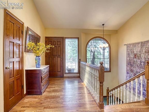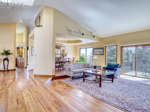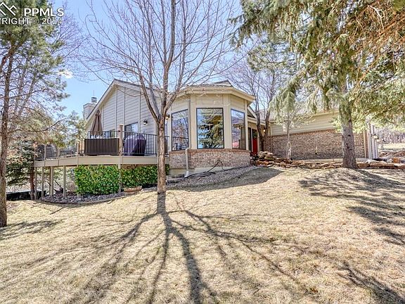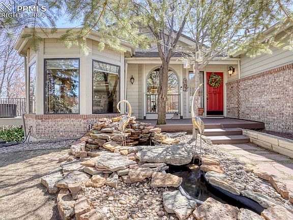 Classic ranch-style living at the Top of Skyway. This charming home has a sprawling lot enveloped in trees - a private sanctuary. The landscaped front yard includes a covered front porch, tranquil water feature and views of the mountains. Natural hardwood floors flow seamlessly throughout the main level, complemented by soaring ceilings and large windows that provide ample natural light. The renovated gourmet kitchen features custom alder cabinets, a gourmet center island with range stove and decorative hood, double ovens and a pantry. It includes an inviting dining area and is adjacent to an intimate den/living room with a cozy fireplace, both opening onto a 12x33ft deck for seamless indoor-outdoor living. The primary suite offers a spacious 5-piece bathroom with a massive walk-in closet and access to a second, more intimate deck. Additional main-level features include a secondary bedroom/office and a laundry room with garage access. Everything that you need on one floor for MAIN LEVEL LIVING! The walkout basement is generous, outfitted with a wet bar and fireplace. Discover three sizable bedrooms including a full-size suite with an adjoining bath, and one with a flexible, large walk-in closet or workspace. This home boasts 4 decks and a flagstone patio - opportunity to enjoy the outdoors from many sides of the home. Situated in a coveted neighborhood with direct access to endless hiking and biking trails and top-rated D12 schools, this home is just minutes from downtown , Old Colorado City, Bear Creek Park (with an array of amenities from pickle-ball courts to playgrounds), and a dog park. This is functional and accessible mountain living!
