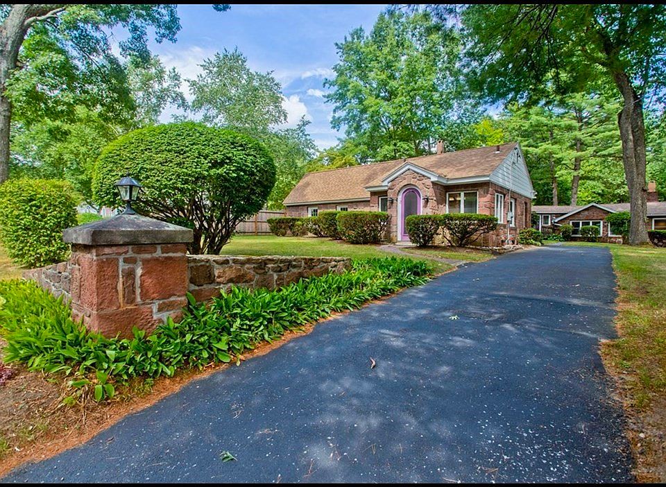 A landmark on route 66, this majestic, executive single-story home is built of distinctive fine red ashlar stone. It forms a compound w/ the main house & guests all sharing a landscaped garden. Though the exterior is as solid as a bank, the interior is remarkably buoyant, w/ delicately paneled ceilings and light-filled rooms. Many improvements update this 1920's home, including NEW Septic system, modern kitchen, Buderus furnace, Mini Splits, and an en suite bath with 1st-floor laundry. The house sits on a wooded and landscaped .7 acres corner lot w/ magnificent oaks and the original stone driveway gate. Exceptional spaces include a cathedral wood-framed dining room, paneled library/gallery, large well-lighted living room w/ fireplace, two large main bedrooms en suite, an additional large family room w/ built-in bookshelves, large mudroom, and the generous guest suite. Out-of-doors boasts a new stone patio w/ firepit, sweeping lawns, and a discreet 2nd driveway to the attached garage.