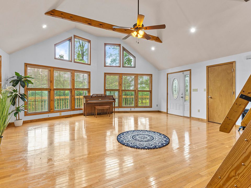 Welcome to your dream chalet! This stunning rustic home features a charming log exterior and a striking green metal roof, seamlessly blending modern elegance with cozy charm. Inside, enjoy two spacious bedrooms and two baths, along with a dedicated laundry room. The open-concept design integrates the kitchen, dining, and great room, enhanced by large windows that flood the space with natural light. An inviting loft adds extra room for relaxation or hobbies. Step outside to a welcoming front deck and a serene, covered, back porch, all surrounded by nature. With a two-car garage and the OPTION to acquire 36 acres of rolling wooded hills (left of driveway), 26.3 acres in front of home, and 11 acres behind home, plus an additional 26.975 acres across Highway 32. This property offers endless possibilities for farming, commercial ventures, or residential development—your private oasis awaits!