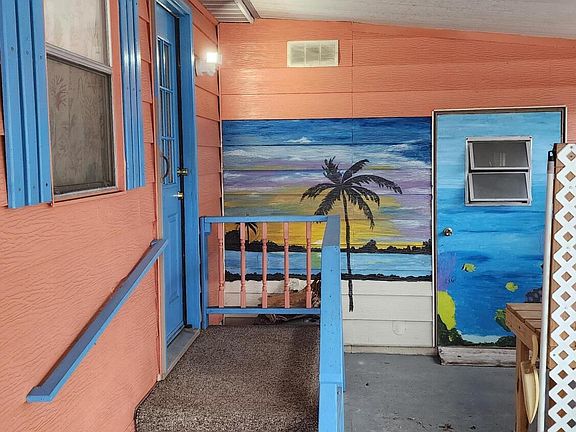 Seller Motivated. Enjoy the Florida life in this MOVE-IN READY, charming, colorful 2BR/2BA artist home! New lifetime rubber roof (2021) and lifetime vapor barrier (2023). Bright and spacious kitchen with artist painted cabinets and pass-through bar area. Large living room with wall of windows and vaulted ceiling. The dining area features built-in cabinets. A family room/sunroom has tinted vinyl windows for day and beautiful evening sunset views. The covered carport has private work space. Utility room/garage area with its own newer golf-cart garage door in the back. 55+ High Point Community where you OWN THE LAND! Low HOA fees include amenities like heated pool, tennis, golf course, horseshoes, bocce, community center, pickle ball and a lots more! sold as-is.
