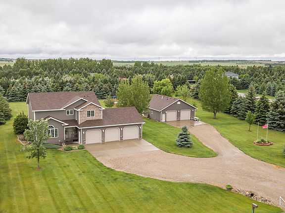 This home is going to make someone very happy!! Located in rural NE Bismarck, on approx 2.66 acres surrounded by mature trees offering privacy and comfort. This desirable home offers 4 bedrooms, 4 bathrooms and MAIN FLOOR LAUNDRY! Enter through the front door and you're greeting by 18' ceilings and gas fireplace in the living room. The kitchen displays a large center island, upgraded appliances and easy care flooring. The laundry room is adjacent to the kitchen and 1/2 bath is right off the garage. Expand upstairs to the master suite thru french doors where you will find a private master bath and walk in closet! There are two additional bedrooms and full bathroom on the upper level. The lower level spotlights a nice sized family room, additional bedroom ,another bathroom and great storage. This Home is full of amenities including 3 Car 28 x 38 garage w/ floor heat, 1360 sq ft detached SHOP w/furnace heating system , AC and pit drain. There is a well on the property for watering the yard and grounds! Don't miss out on the treed lined backyard and room for a great garden spot! Unlock the door and make this your home today!