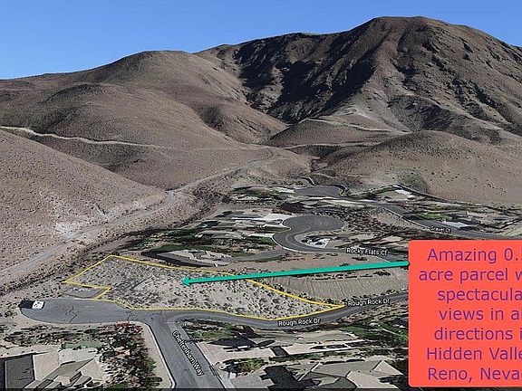 Amazing 0.59 acre parcel with 360 degree views in Hidden Valley, Reno, NV Highly desired area with water, power, sewer, and natural gas to lot Property Address: 7350 Rough Rock Dr, Reno, NV 89502 Latitude/Longitude: 39.494320, -119.710000 County: Washoe Subdivision: Sharon Hills Google Map - https://goo.gl/maps/ZARb7JR87aedJ1pH9 Directions: From downtown Reno NV, Get on I-80 E, Follow I-80 E to Sparks Blvd in Sparks. Take exit 20 from I-80 E, Turn right onto Sparks Blvd, Continue onto Veterans Pkwy, Turn left onto Pembroke Dr, Turn left onto Cheltenham Way, Cheltenham Way turns right and becomes Rough Rock Dr, Follow to 7350 Rough Rock Drive PRICE: $150,000 Plus closing costs Owner will finance with reasonable down payment. Finance price will include account servicing fee and monthly tax payment. Credit card payments are charged an additional 3% Permitted uses: Single Family Homes Property Description: This is an amazing opportunity to own this highly desired 0.59 acre parcel in Hidden Valley, Reno, Nevada. This property is situated higher up the hill, which gives you stunning views in all directions in this well developed, highly desirable neighborhood with water, power, sewer and natural gas to lot. This area has year-round outdoor recreational activities throughout the area. In summer there are golf courses and endless water recreation at Lake Tahoe, Pyramid Lake and the Truckee River for fishing, boating, jet skiing and relaxing on the shoreline. In the winter there are 18 ski resorts (8 major resorts) within 100 miles and some as close as 11 miles, along with miles of trails for cross country skiing and snowmobiling. This is a prime lot with endless amenities a short distance away. Property Info Power: Yes - $1500 install fee Sewer: Yes - $47.33 sewer monthly + $6.370.00 connection fee Water: Yes - Meter box is existing with good water flow and is 3/4”. Fees already paid Gas: Yes - Natural Gas Telephone: Yes Cable: Yes Impact Fees Paid: No Permits: No Fence: No Access: Public Road - Paved HOA: No Survey: Yes CCR's: Yes Property Details Parcel Number: 051-712-12 Property Type: Single Family Residential Vacant Land Lot Size: 25,587 Sq Ft Acres: 0.59 AC Topography: Sloped Dimensions: 113x128x171x208x67x40x48 ft Shape: Irregular Zoned: MDS - Medium Density Suburban FEMA Flood Hazard Zone: X FEMA Floodway: Out Yearly Tax Amount: $1,234.89 Road Type: Paved Road Maintenance: County School District: Washoe County School District Legal: Sharon Hill 10 Lt 75 Assessor Details - https://www.washoecounty.us/assessor/cama/?parid=05171212 Tax Details - https://nv-washoe-treasurer.manatron.com/Tabs/TaxSearch/AccountDetail.aspx?p=05171212&a=199397 Photos - https://photos.app.goo.gl/8kWhK9RLtkNn61Hp8 Washoe Regional Mapping System - https://gis.washoecounty.us/wrms/?apn=051-712-12 Building Department Office:775.328.2020 Building@washoecounty.us Planning & Building Division: 775.328.3627 planning@washoecounty.us All properties are sold AS-IS. Buyer is to pay all closing costs and to do their own independent due diligence. One or more members of corporation is a licensed real estate agent in the State of Arizona Map of Land Available and helpful info https://www.affordablelandusa.com/land_available Thank you, Brad LaSalle Infinite Acres, LLC 4609 E Cooper St Tucson, AZ 85711 (520) 214-5303 affordablelandnow@gmail.com www.AffordableLandUSA.com www.facebook.com/AffordableLandUSA