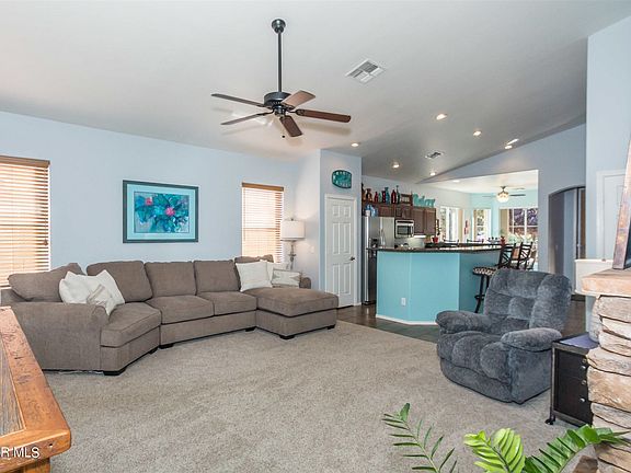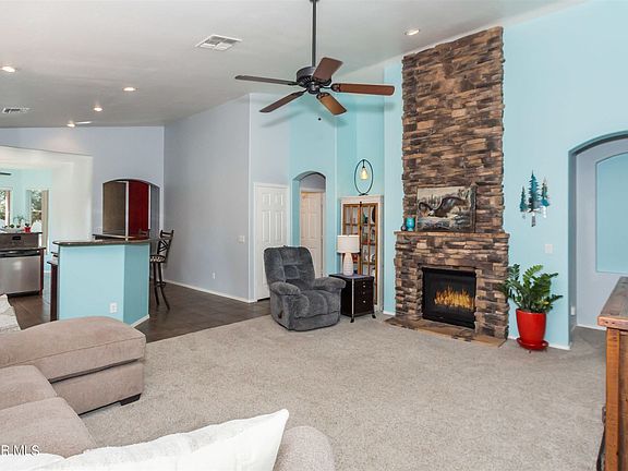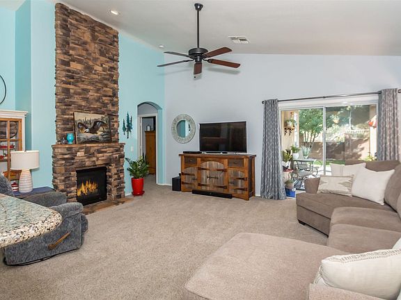 Beautiful ''Kingman Plan'' 1597 Sq Ft. 3 Bd, 2 Ba, 2 Car Gar. Fresh Paint, Stacked Rock Accents on Ext. Super Clean, Move-in-Ready. Gorgeous Granite on the Kitchen Counters ,Center Island and Both Bathrooms. Stainless Appliances, Cherry Cabinetry, Separate Pantry, Perfect for Entertaining. Includes Stainless Refrigerator. Perfect Natural Lighting from the Bay Window to Dining Area. Floor to Ceiling Rock Fireplace and Vaulted Ceiling in Great Room. Owner Suite w/Large Bay Window, Walk-in Closet, Glass Enclosed Shower and Oval Garden Tub. Backyard View Opens to Natural Space. Extensive Backyard Landscaping, Ext. Paver and Concrete Walkway, Gas BBQ Stub out, Very Private. Additional Home Upgrades Include, Paneled Doors, 12'' Tiled Flooring, Gas Stove, Lighted Ceiling Fans, Ext. Patio Cover.