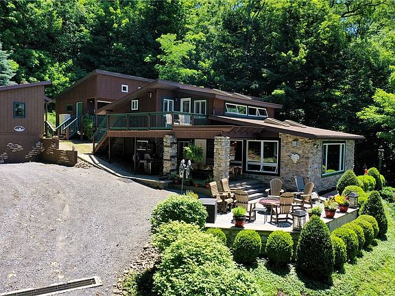 Keuka Lake West Bluff Drive - What a setting for this beautiful lakeview home with 110 feet of Keuka Lake shoreline. Three bedrooms and 1 and half baths, hardwood kitchen, great room which offers spectacular views of the lake and surrounding hills. The second level offers a sun room, 2 bedrooms, half bath/laundry and 2 private decks. There are also 2 spacious covered decks one on each side of the house. Along with a lower fire pit patio. Includes a 16'x20' workshop with heat and air conditioning and a 10'x12' storage building. Lakeside offers shale beach, a finished 7'x14' shed, a deck with a bar and four stools. The new permanent dock has a covered electrical boat lift and a 15'x15' lounge area. Property has meticulous and tasteful detail throughout along with beautiful lake views, gorgeous sunsets, privacy, wildlife, perennial gardens and parking. Realist square footage does not reflect the addition to the property.