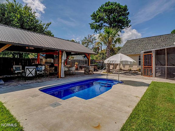 You won't believe the backyard oasis waiting for you in this spacious single-story home, conveniently located off of Middle Sound Loop Rd. Just minutes to Wrightsville Beach, shopping and dining, and in a wonderful school district, this 3 bed/2 bath home features vaulted ceilings, an updated kitchen with eat-in living area, a spacious two-car garage with oversized door(so that you can actually fit those two cars), and a separate office space set above the living area. If you like entertaining you'll love the huge flex living room with built-in bar almost as much as you'll love the resort-style atmosphere in the back yard...the in-ground pool and hot tub create a beautiful setting but the oversized grilling cabana will truly blow you away with its gorgeous pine ceilings and living area with wood-burning fireplace. Ping-pong patio, outdoor shower, multiple storage sheds, boat parking area, and grassy lawn space. What more could you ask for?!