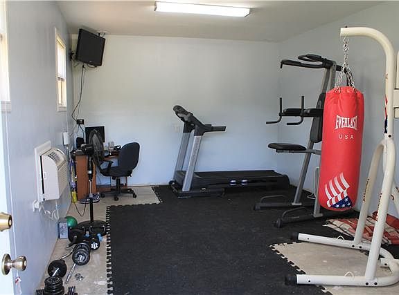 Beautiful home with lots of storage! Master bath with step-up whirlpool tub, shower and double sinks. Two-car attached garage and 2-car air conditioned detached garage with exercise room! Great lot with home built off of road.