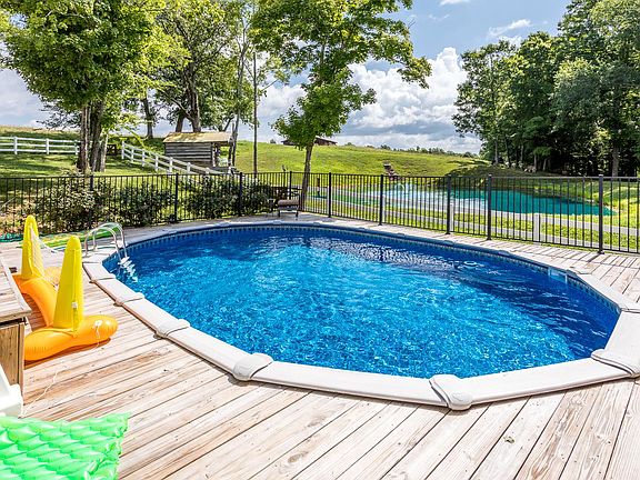Own a piece of history! This renovated 1827 farmhouse is loaded with modern design elements yet still maintains it's historic charm. Every inch of space is utilized. This retreat features a lake with fountain, creek, pool, hot tub, original cabin, and a barn A perfect mix of pasture and woods. Fenced for animals. 10.43 acres. Oversized 2 car garage