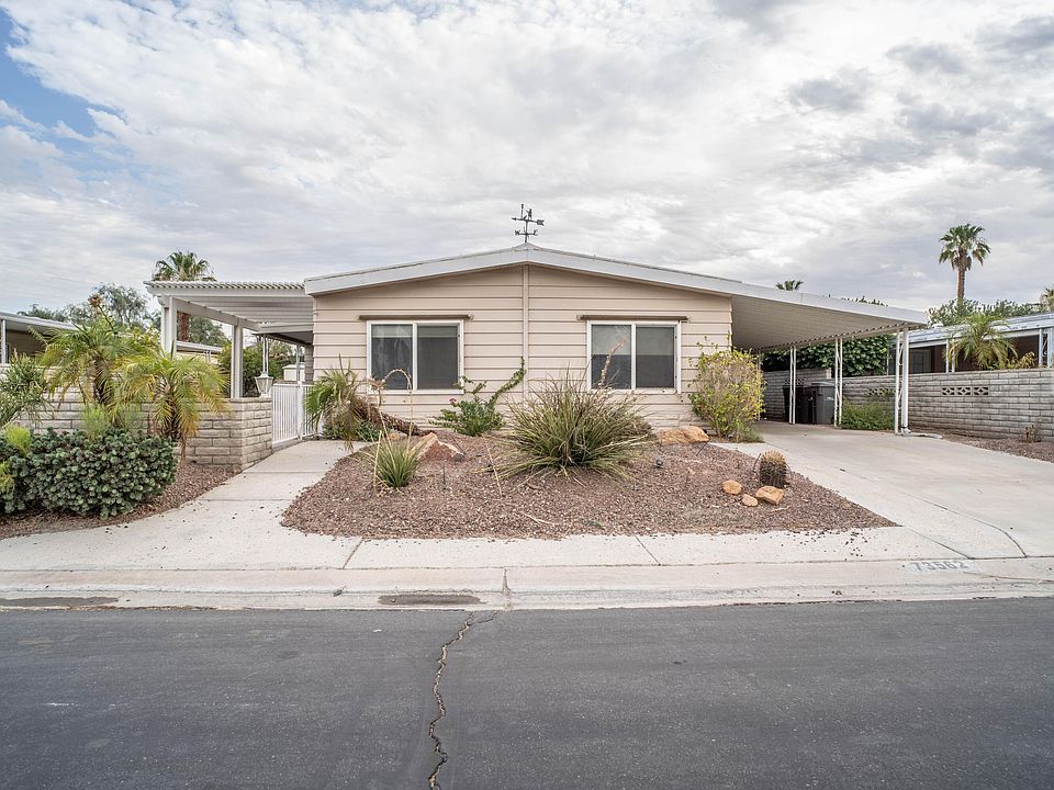 Incredible opportunity on this Triple-Wide 2 Bedroom, 2 bath Manufactured Home at Palm Desert Greens Country Club, an active 55+ community. The open and inviting floor plan features an updated kitchen with center island and breakfast bar seating. A spacious great room boasts fantastic SW mountain views and is open to the dining area and kitchen. A den/family room offers a fantastic built-in desk with custom shelving. The bathroom in the primary suite was nicely updated with a large walk-in shower, newer vanities and a block glass window allows great natural light to shine in yet very private!! A huge walk-in closet with sliding mirrored wardrobe doors adds to the spaciousness. Additional guest room is situated at the front of the home with direct access to the second bath. The home has a great covered patio with mountain views on the west side and deep carport on the east plus a golf cart garage/oversized shed. Palm Desert Greens low HOA includes Cable TV, Internet and residents GOLF FREE with no initiation fees. Amenities include an 18-hole executive golf course, Pro Shop, Updated Clubhouse with Dining and Entertainment, Fitness Center, Community Pools, Tennis And Pickle Ball Courts, Bocce Ball (right across from the house), Billiards, Shuffle Board and plenty of active clubs and social events! Close to medical center, shopping, freeway access and more!