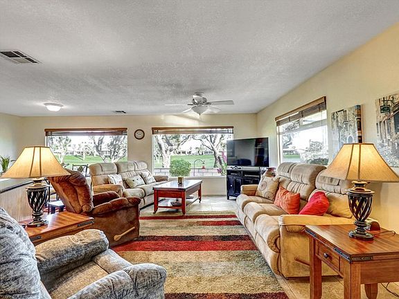 Luxury living at it's best. With spectacular golf course views which boast a water feature on the tenth hole. Entertain your family and friends on the patio with a large table that seats 8 which includes a built in fire pit. This patio exudes fun with a TV and hot tub for 2. The open floor plan has tiled flooring, all stainless steel appliances and granite counter tops. The two extremely large picture windows in the living room showcase the outside golf and mountain views. This 2 bedroom , 2 bathroom home has it all. Plenty of storage for all your toys in a very large air conditioned shed. Plus just a short walk to the clubhouse. This beautiful oasis is being sold 'TURN KEY'. Nothing to do but move in and relax and enjoy. Truly a must see.