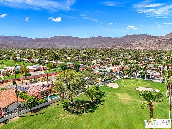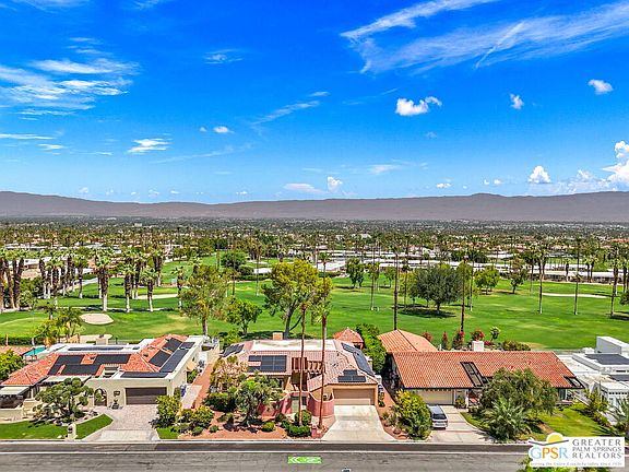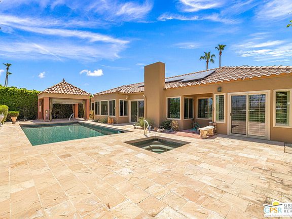 EXCEPTIONAL OPPORTUNITY! Don't miss this hacienda-inspired architectural fronting the fairway at Shadow Mountain Golf Club! NO HOA fees + owned SOLAR make it all the sweeter. BIG MOUNTAIN VIEWS to the North and West work their MAGIC! Loving the PRIME South Palm Desert location - just a short hop to El Paseo. Welcome guests by way of a private, walled courtyard and once through double doors, the beamed and vaulted ceilings and floor-to-ceiling brickwork are sure to delight. You'll find mountain views are a theme throughout, both to the North and South. Formal dining takes in the elevated pool terrace and golf course and it's built-in display cabinet and marble buffet are sure to delight. The light + bright kitchen with stylish finishes is centered around an island. The breakfast room opens to a tile-roofed gazebo with recessed ceiling. This special setting at the end of the pool is sensational and perfect for entertaining. All bedrooms are configured ensuite and enjoy a nice separation. Take the Matterport VIRTUAL TOUR for a better sense. The Primary features direct pool access, a sunken tub with south-facing mountain views, glass block shower, double vanities, skylights, large walk-in closet and dressing area. Ensuite #2 with murphy bed is positioned behind double doors and enjoys extensive built-ins and views to the South. Ensuite Guest Bedroom #3 is positioned off the kitchen with glass block shower and skylight. Laundry area is located off the kitchen and includes expansive storage and large freezer. Two-car garage with bonus room which also opens to the front courtyard. This could be enjoyed as a home office. Notable upgrades include newer dual pane windows and sliders throughout, and artificial turf. Enjoy it all!