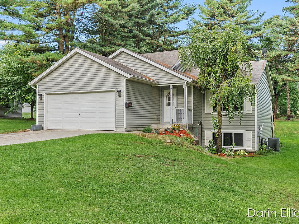 Hard to find 2003 built 5 Bed, 2 Full Bath, 2200+ sq ft multi-level home on large, wooded lot. Updated kitchen with granite counters and all appliances. Wide open living and dining room with sliders to large deck. Lower-level family/rec room has gas fireplace, sliders, to the lower-level deck, and a full bath. Upper-level Master with large walk-in closet. Entire upper level could easily be used as a true Master Suite. Home is mechanically sound including brand new furnace, central air, and a 2-year-old H2O heater. New windows throughout. Underground Sprinkling. Smart garage door opener and thermostat. This is a great location just a minute to M57, the retail strip, and easy commute to US131/GR. Natural gas and high-speed internet attached. Hurry to show!
