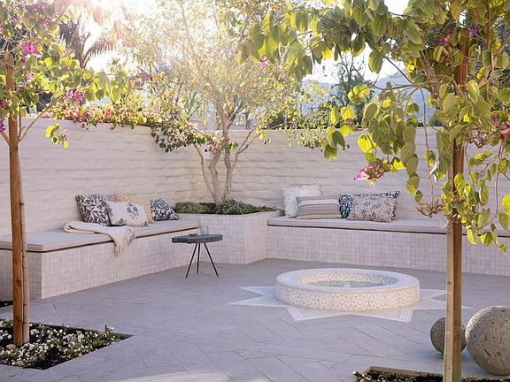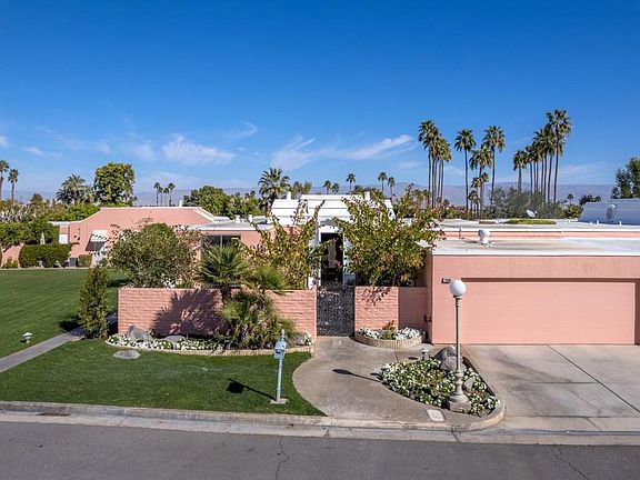 This Marrakesh Country Club 3-bedroom, 3 bath, 2427 sq foot home welcomes you with a flourishing garden courtyard. Enjoy the scene of Moroccan tile built in benches surrounding a tranquil fountain with custom mosaic tiles in neutral Zen tones. Stepping forward through a path of Hong Kong Orchid trees, enter the ten-foot double doors to the newly remodeled home, by Chris Barrett Design, featured in Palm Springs Life Magazine. The kitchen is dramatic, clean, and layered with contrast. Marble slab counters, open to the dining area, are the perfect spot for entertaining or to enjoy a casual meal. All new Bertazzoni appliances, custom floor to ceiling cabinetry is a chefs dream. The cabinet pantry is the perfect hidden spot for your espresso maker. All the mid-century lighting fixtures, hand curated, have been chosen to perfection. The eclectic mix of new and vintage chandeliers work in dramatic contrast to the soaring floor to ceiling windows flanked by custom creamy wool drapery. Many rooms feature colorful wall covering including the third Bedroom/office which has a flock of whimsical Gucci Herron's. The baths have marble counters with marble tile surrounds in classic white and black. All Waterworks plumbing fixtures are the final discerning detail. This home is in the center of Marrakesh with the picturesque views of peaceful green golf courses and the many pools. It is the largest plan that was originally designed by architect's John Elgin Woolf and Richard Harrison