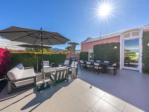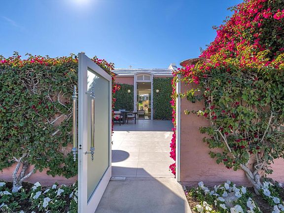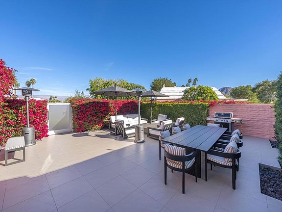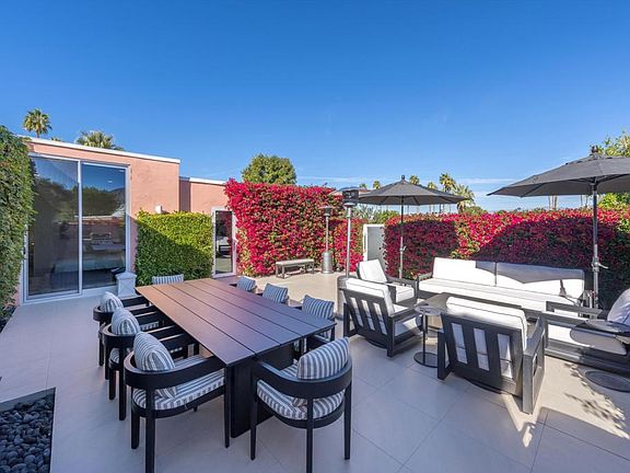 Welcome to this stunning Hollywood Regency home where luxury, style and elegance blend seamlessly with high-end country club living. Originally designed by renowned architect John Elgin Woolf and remodeled to perfection, this gorgeous desert oasis offers an unparalleled experience that will leave you breathless at every turn. You'll immediately appreciate the attention to detail and flawless finishes throughout. The modern living spaces flow effortlessly into expansive terraces, perfect for indoor-outdoor living. Tall glass sliders stack to marry the outdoors with the indoors, creating a harmonious balance. The fully reimagined galley style chef's kitchen boasts custom stonework, sleek cabinetry, and a breakfast bar. The dining area offers a million-dollar view through a customized full height window. Two spacious bedrooms are thoughtfully separated for privacy, while the lavish primary bathroom features a floating dual vanity, oversized glass shower and a top-notch hotel-style outdoor tub, inviting you to indulge in relaxation. An office with a separate entrance can be easily converted into a third bedroom. Additional upgrades include all new exterior doors with tinted glass inserts, solid wood interior doors, motorized window coverings, retractable awning on back terrace and new A/C. Situated in a prime location, this turnkey furnished property also comes with a golf cart. Don't miss the opportunity to own this incredible home that epitomizes the best in high-end living!