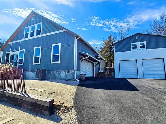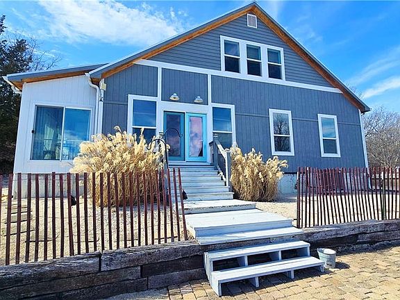 Nestled on the West shoreline of Lake Fort Scott, this stunning custom-built home is spacious and well-appointed. Designed to accommodate both the comforts of every day living and efficient entertaining, it's the perfect full-time residence, weekend retreat, or vacation rental - cozy enough for a few people, but large enough for many! The main floor is packed full of character, thanks to design details like shiplap, sliding doors, wood and metal accents, and nautical rope! The open-concept living area and all-season sunroom fill with natural light from huge windows that overlook the lake, providing picturesque views of the water and the visiting wildlife. Living and dining spaces flank the well-appointed kitchen, complete with quartz countertops and custom cabinetry. A large primary suite provides privacy and convenient first-floor living, while the mudroom, laundry, and another full bath complete this level. Upstairs, you'll find a second living area, along with another generously sized bedroom offering panoramic lake views, plus the third bedroom and full bath which round out the second floor. Storage is abundant inside, but it is also plentiful outside. There is not only an attached garage, but also a detached 2-car garage with 10' roll-up doors—ideal for storing boats, fishing gear, or ATVs. Above, a loft space holds endless possibilities as a guest studio, hobby room, or office. With its various outdoor spaces, the home truly captures the beauty and tranquility of lakeside living. The dock has a boat slip and sitting area, perfect for fishing or swimming off the ladder. Even when you’re not waterfront, beauty surrounds the home - a fire pit area in the front, decks on the side, and nature-filled woods to the back. And since the home is situated on the no-wake end of the lake, all of this can be enjoyed in peace and quiet, with very little boat or road traffic. This gorgeous property offers the best of Fort Scott Lake living—schedule your private tour today!