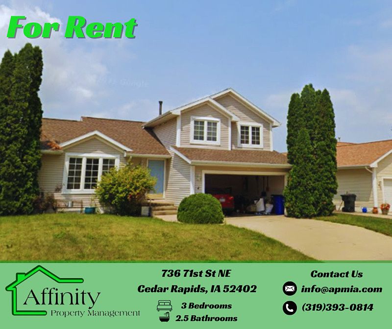 3 Bedroom, 2.5 Bathroom Single Family Home located in Cedar Rapids! This split level house is located in the north east side of Cedar Rapids and features forced/central air for heating & cooling, garage, and a medium sized back yard. The living room features large, sunny window facing 71st Street, vaulted ceiling, new LVP flooring [2023], and space for a dining room table. The full kitchen features new LVP flooring [2023], dishwasher, plenty of cupboard/cabinetry space, space for a table, and access to the back yard. The spacious lower level rec room features gas fireplace and new carpet [2023]. The master bedroom features new carpet [2023], walk-in closet, fits up to a king size bed, and has private ensuite with full tub. Secondary bedrooms #2 and #3 feature new carpet [2023], fits up to queen size beds, and have full size closets. The shared bathroom on the floor with the bedrooms features new LVP flooring [2023] and a full tub. The half bathroom on the lower level rec space floor also features new LVP flooring [2023] and a washer/dryer [included]. The basement is unfinished and can be used for dry storage. The [CONNECTED] 2-Car garage features garage door opener. Landlord Responsibilities - Utilities and Services: - NONE Tenant Responsibilities - Utilities and Services: + Electricity: Alliant Energy - Monthly Average: $135** + Gas: MidAmerican - Monthly Average: $75** + Water/Sewage/Recycling/Garbage: - City of Cedar Rapids - Monthly Average: $100** + Snow Removal: Bring Your Own Shovel! + Lawn Care: Bring Your Own Mower! **Monthly Average varies with individual use and may not accurately reflect average costs. Pet Details: Dog(s) Allowed: Limit of 2 | Up to 30lbs | Breed Restrictions Apply | Updated Vax Records Pet Fee(s): $40 Per Pet/Per Month Affinity Property Management is proud to offer deposit-free living to qualified renters through Obligo! We understand that moving costs can add up, so we want to extend financial flexibility to our residents. When you move in with us, you can skip paying a security deposit and keep the cash for activities you care about. Additional Disclaimers: *Application Fee(s): $40 Per Adult *Application Process consists of credit and criminal background check, income requirements, and rental reference checks. *Affinity Property Management reserves the right to deny applicants with a previous eviction, unpaid balances, and criminal history. *Advertisement photographs and/or videos may be of a similar property.