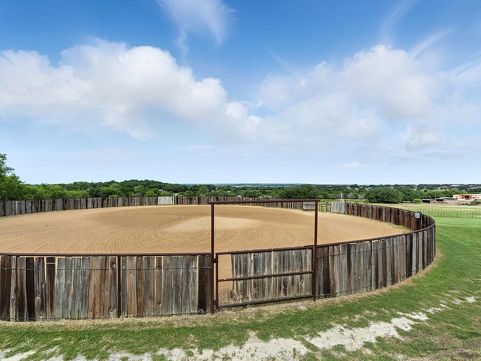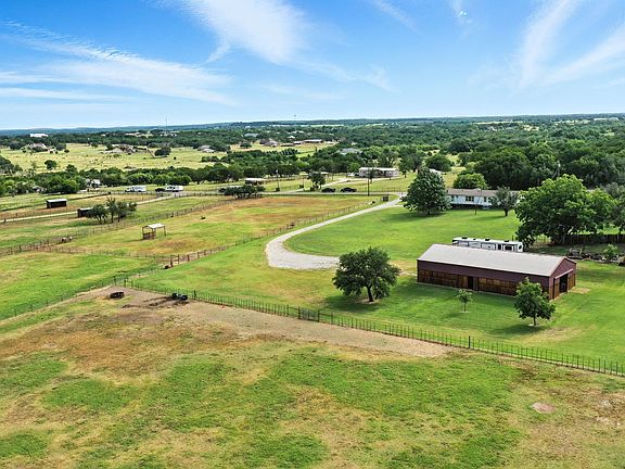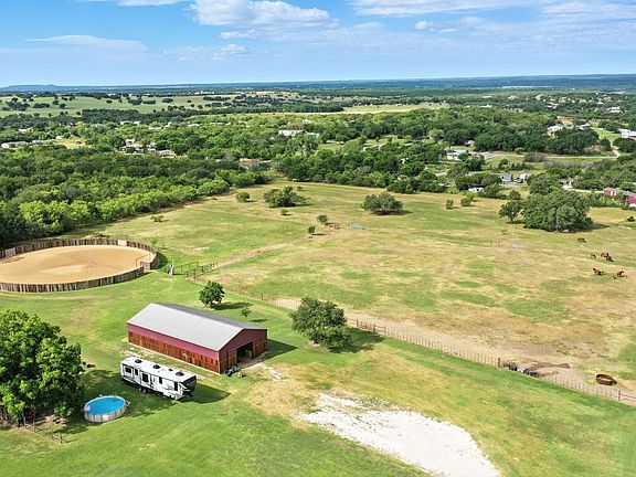 Exceptional 16.647± acre horse property located right next to Silverado on the Brazos—no HOA, no deed restrictions, and no known easements. This turnkey setup is cross-fenced into 7 pastures with slick wire and horse-friendly mesh fencing, ideal for managing broodmares and foals. All pastures are in Coastal Bermuda and include freeze-proof water spigots, plus a quarter-acre stock pond. The sandy loam soil and gently rolling topography make this a highly productive and scenic place to build your dream home. A 40x70 show barn features 10 stalls (12x12) with front and back windows for airflow, a tack room, hot water wash rack, and a 220-amp RV hookup. A 140-foot round pen provides excellent training space. Two water wells supply the entire property. The 2000 Palm Harbor double-wide home offers 2,128 sq ft with 4 bedrooms, 2 baths, and a 2-car carport. Mature live oaks provide shade and beauty, and the property sits on a quiet cul-de-sac with incredible views that stretch across Silverado and all the way to the Brazos River. This is as close as you can get to living inside Silverado without being in the development—ideal for horse owners seeking a private, unrestricted property in a premier Parker County location.