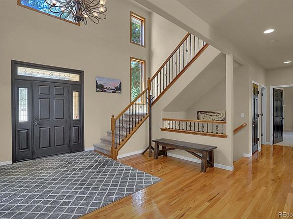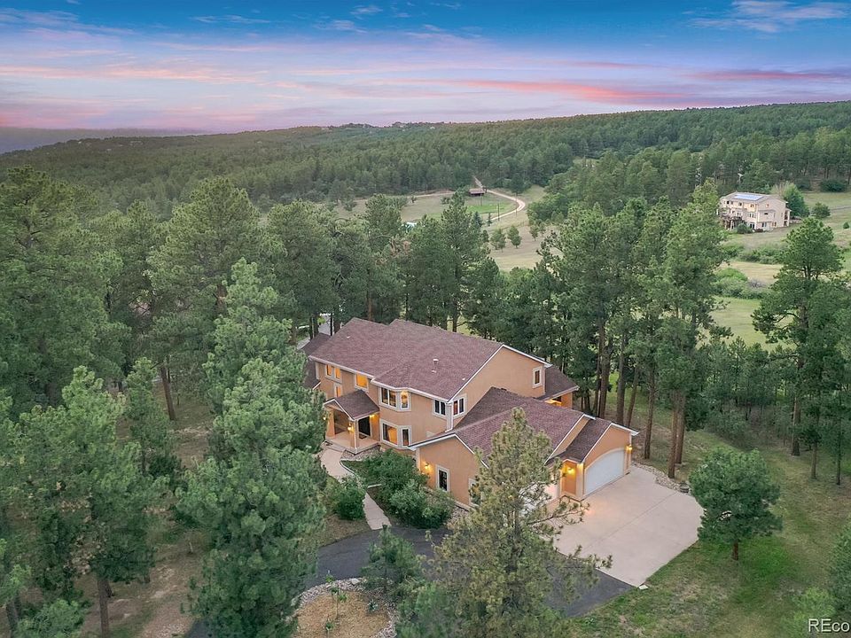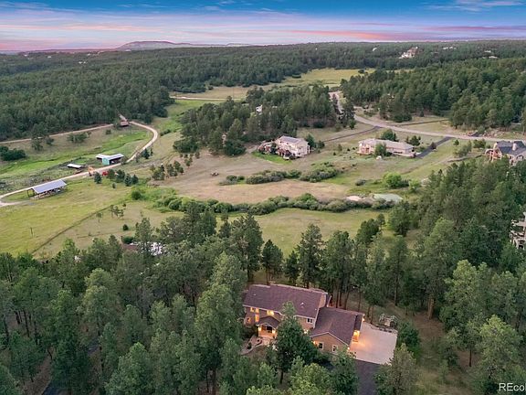Looking for the perfect mix of privacy and convenience, then look no further. This exceptional 2 story with main level master on over 2.5 acres is set among 100 foot tall Ponderosa Pines & just 45 minutes to DTC & 30 minutes to Downtown Colorado Springs. Outdoor features abound from the walkout basement, huge deck with built in grill, sports court, rear patio, over-sized finished 4 car garage & incredible setting ideal for entertaining & quiet enjoyment. No detail has been missed on the custom home. Inside the home you will find and open, light and bright floor- plan that is a entertainer's dream. All the main level rooms flow off the Grand-room and provide a central family gathering locale. There is a beautiful kitchen with bar seating and two access points (one off the kitchen and Grand-room) to the deck. There is an amazing great room in the basement with wet bar and built-ins to allow you to enjoy your favorite team or family game night. Two of the lower level rooms could function as a 6th bedroom if needed. The large formal dining room has coffered ceilings, there is a dramatic two story entry, office on the main level and huge main level laundry. Take the time to see this special home.