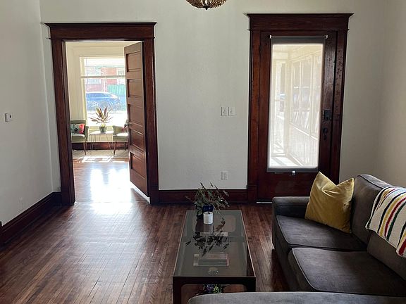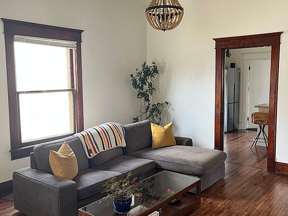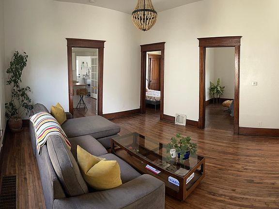 Charming remodeled 1902 house with high ceilings, refinished original hardwood floors and gorgeous wood molding throughout the house. Fully remodeled kitchen and bath, walk-in pantry and mud room/laundry room with a deep utility sink. Front and back irrigation system, wraparound porch, backyard raised garden beds, flagstone patio and back deck with shade. Downstairs unfinished storage/cellar (room to walk). Perfect location, with just a 5-minute walk to downtown Loveland and 6 blocks to Eisenhower. Renter is responsible for all utilities and city yard maintenance policies: mowing & shoveling. No smokers. 1 year lease.