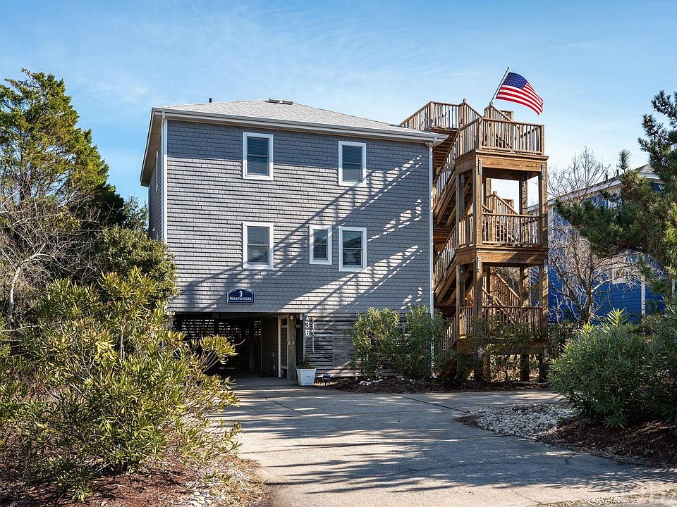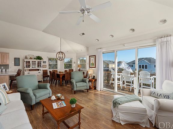 Discover the epitome of coastal living in this 4-bedroom, 3-bathroom home with nearly 1900 square feet of sophisticated living space, multiple decks, hot tub, fenced yard, and a Stair Tower allowing access to the rooftop deck. LVT flooring, along with fresh paint throughout the home, and an Energy Star roof, showcase the pride of ownership evident in this well-maintained property. With comfort and convenience in mind, this meticulous turn-key home will please the most discerning buyers. The upper level impresses with a floor plan that is open, airy, and flooded with natural light, creating a welcoming atmosphere throughout. The easy flow between the family room, kitchen and dining area ensures a laid-back and spacious feel, perfect for relaxed living. The well-appointed kitchen boasts stainless steel appliances, white quartz countertops, and pickled oak cabinetry, providing a perfect blend of style and functionality. With ample linear counter space, cabinet storage, and a convenient breakfast bar, this kitchen is not only functional but also attractive, featuring a deep sink, tile backsplash, and whimsical starfish knobs. Adjacent to the kitchen is a spacious dining area, ideal for hosting gatherings with friends and family. The family room features a cozy gas fireplace for those chilly evenings. Step out onto the expansive sundeck accessible from the family room, offering a delightful outdoor space for relaxation and entertainment. An upper-level bedroom is thoughtfully converted into a comfortable den/office area, catering to the demands of modern living. A full hall bath completes this level, ensuring convenience for family and guests. The mid-level is dedicated to comfort, featuring an oversized primary ensuite for ultimate relaxation. Two additional bedrooms, which share a Jack and Jill bathroom, provide ample space for family members or guests. The convenience of a laundry area on this level adds practicality to daily living. However, the true highlight of this property is the impressive stair tower, providing access to each level and culminating in a spectacular rooftop deck. Enjoy breathtaking ocean views to the east and create lasting memories under the stars in this enchanting outdoor space. This home effortlessly combines comfort with practicality, presenting a unique chance to own a property where meticulous attention has been given to every detail. Situated on an X flood zone lot within the family-friendly Ocean Sands community, it provides convenient proximity to the beach, retail shops, grocery stores, restaurants, and Corolla's various attractions.